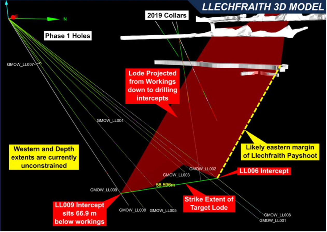 This Phase 1 surface drilling programme (Fig. 1), targeting mineralisation below the existing mine workings at Llechfraith to test the continuation of mineralisation at depth, has returned better than expected results promoting the Company to extend its drilling programme.