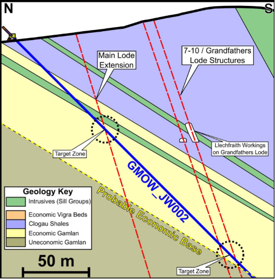 Figure 2 shows the indicative trajectory of planned surface drill hole JW002, which aims to intersect mineralisation in both the Main Lode and 7-10/Grandfathers Lode extensions.
