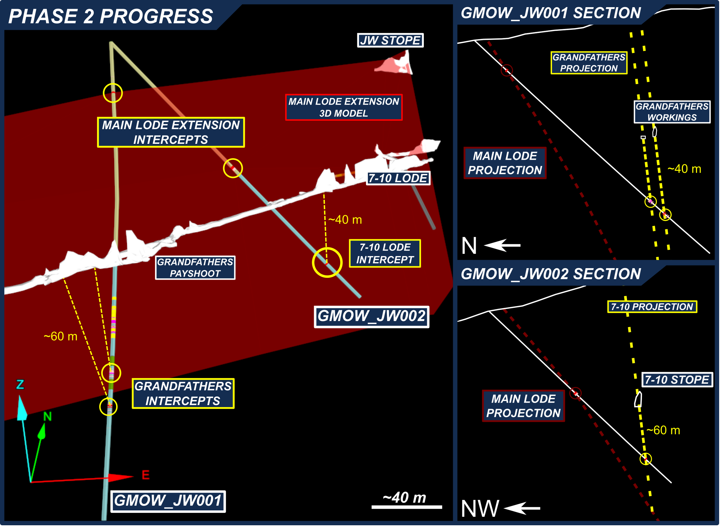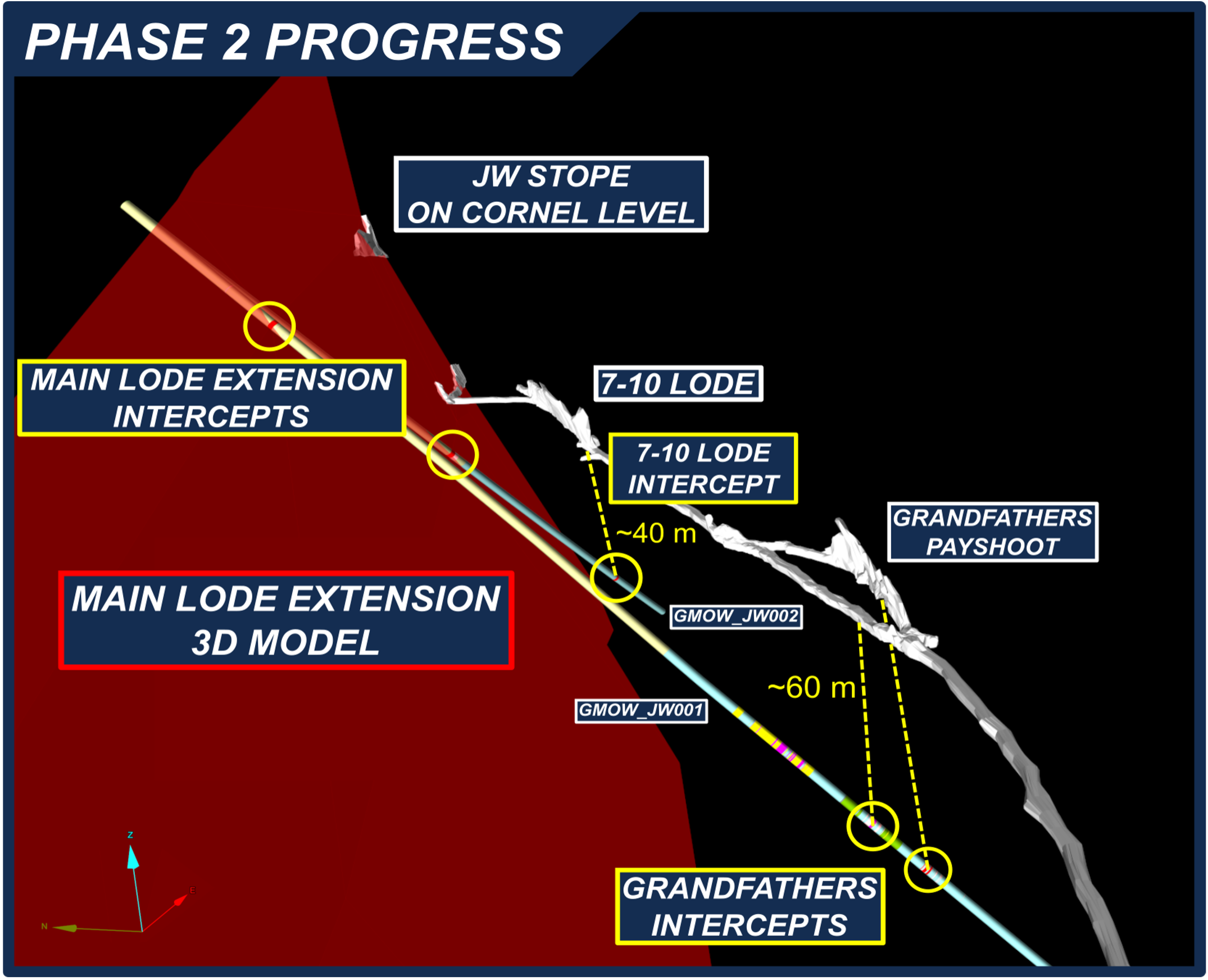 Figure 5: Oblique view of the target Lode model, highlighting where GMOW_JW001 and GMOW_JW002 have intersected depth extensions of two key areas of production (Grandfathers and 7-10 Stopes respectively). Relative scales are given in yellow