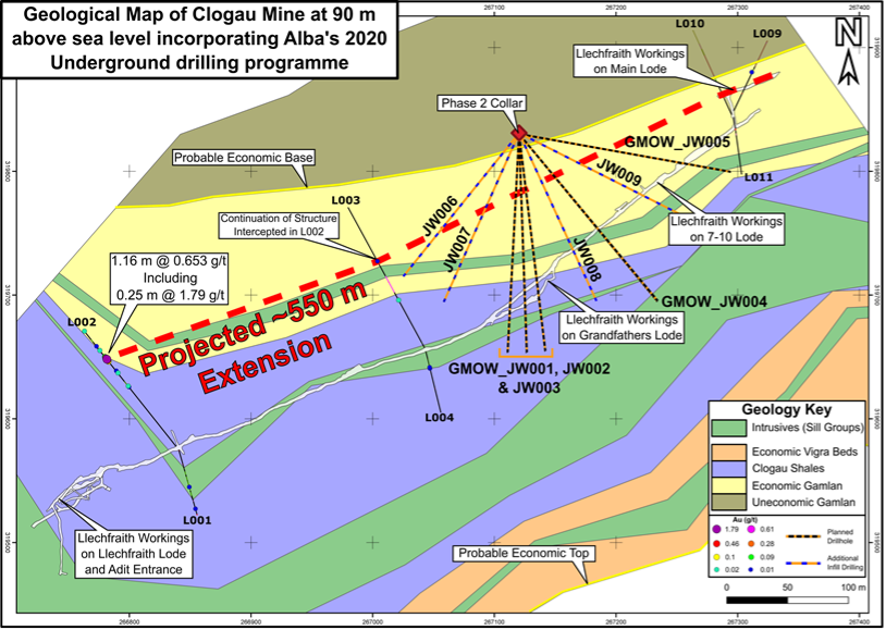 Phase 1 intersected, what Alba believes to be, the westerly 550-metre extension of the Clogau Main Lode, which has historically been the main source of Gold production at Clogau-St David’s Gold Mine.