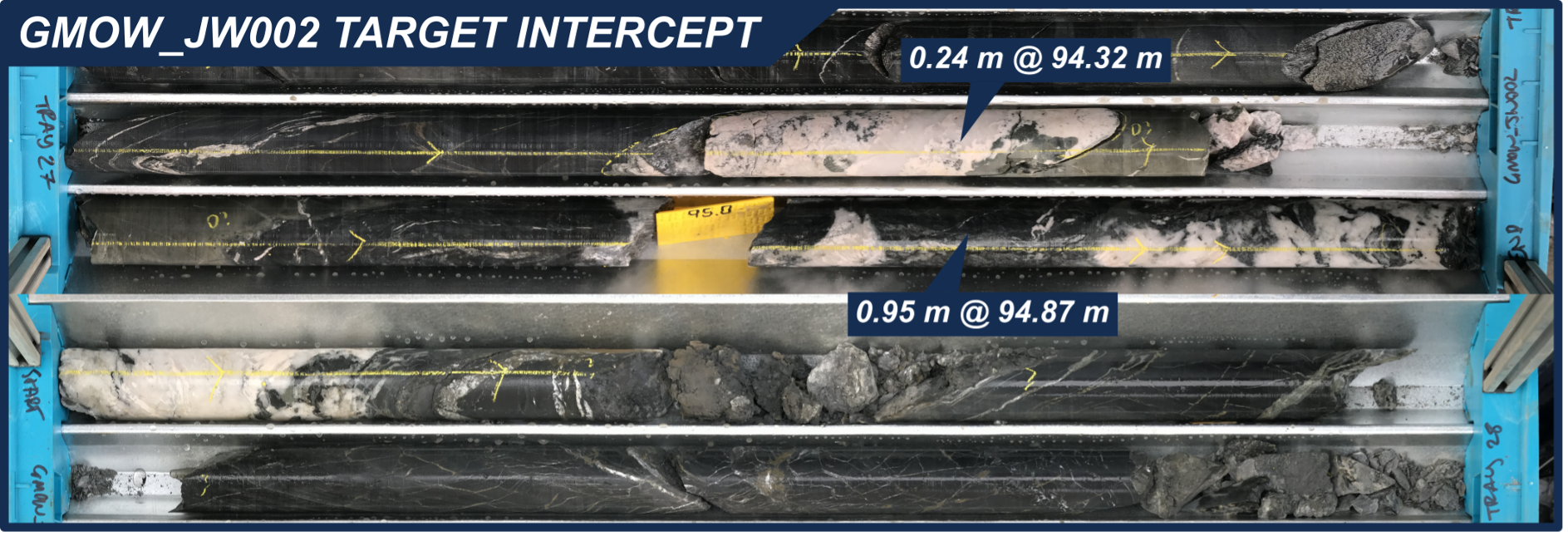 Figure 7: Photo of Main Lode in JW002, with two intercepts split by Clogau Stone Dyke from 94.32 m.