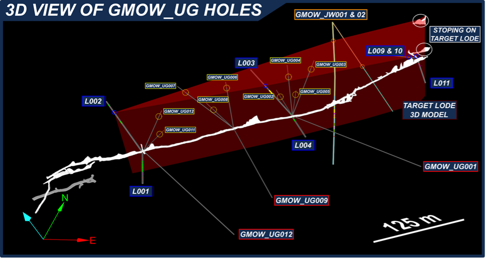 Phase 2 underground drilling programme (labelled GMOW_UG001 to GMOW_UG012) is illustrated in Figure 1 with most holes to be drilled to the North, with three holes drilled to the South to test for a Southern lode structure.