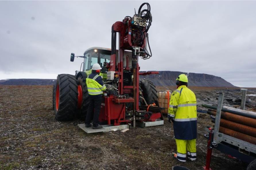 Figure 2: White Eagle’s tractor-mounted Sonic Drill on the coastal plain with the Dundas Mountains in the background.