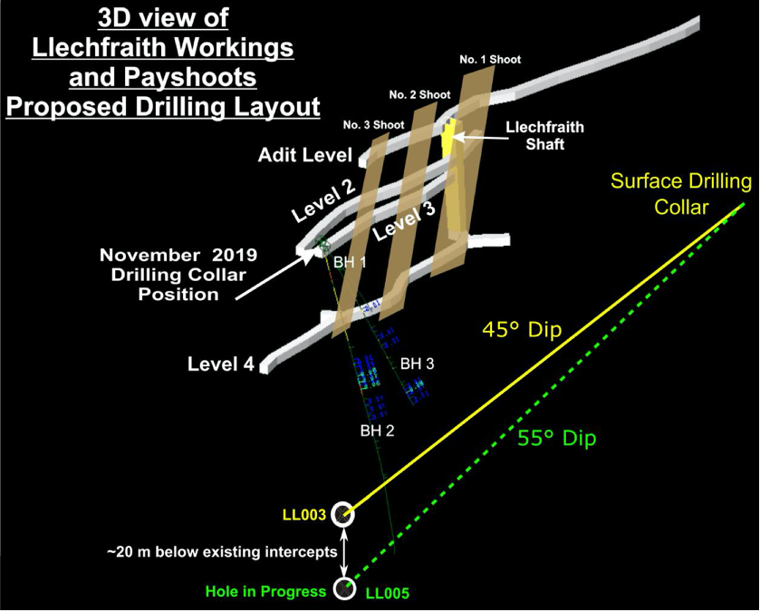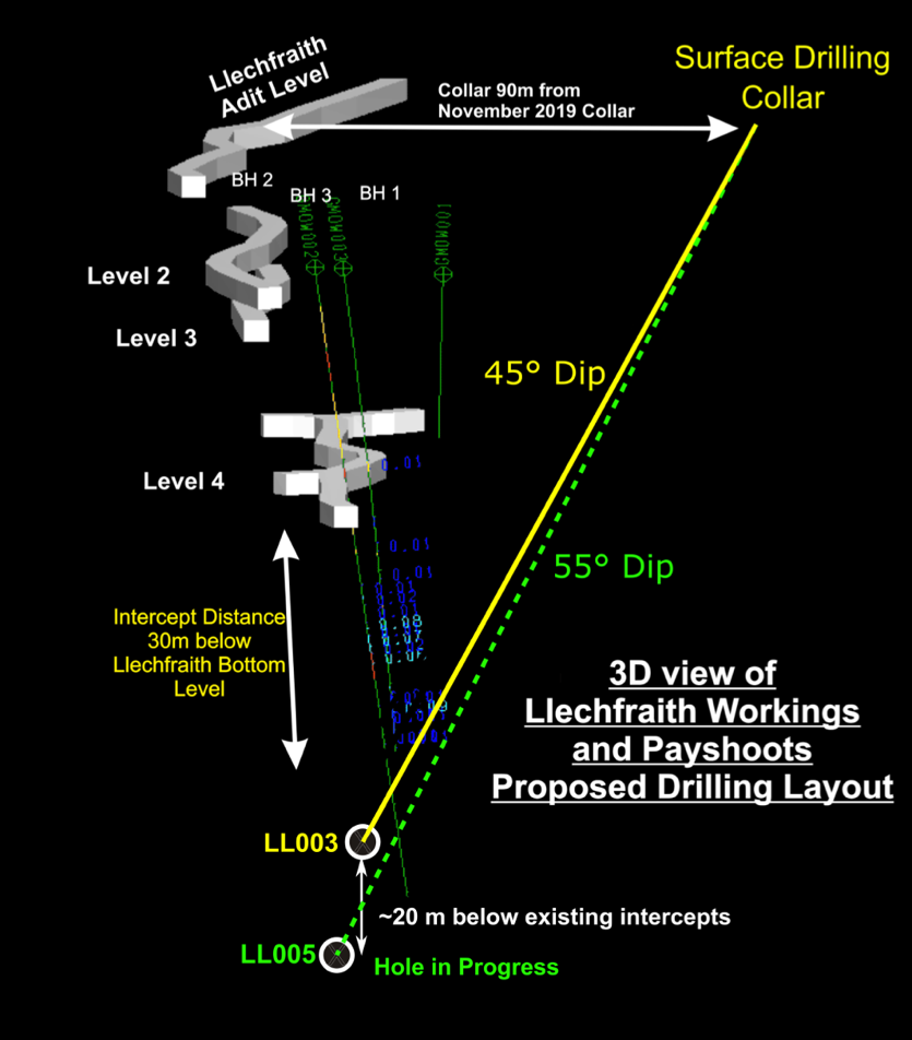 Figures 1 and 2: 3D views of Llechfraith mine workings (labelled Adit Level and Levels 2-4), showing difference in dip of proposed drill hole LL005 compared to completed drill hole LL003. Drill traces for the November 2019 drilling campaign also shown (drill holes BH1-3).