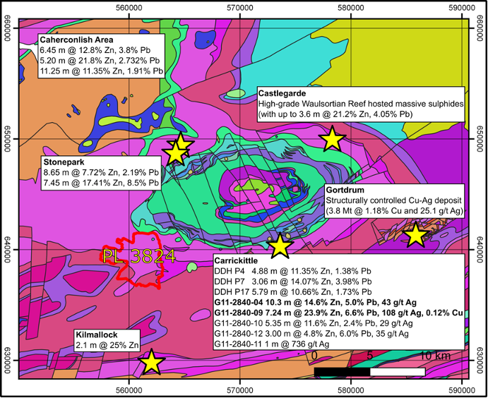 Figure. 2 below highlights the significant drill results (with locations marked by stars and drill results shown in text boxes) at zinc-lead projects within the immediate vicinity of Alba’s Limerick Base Metals Project, PL 3824
