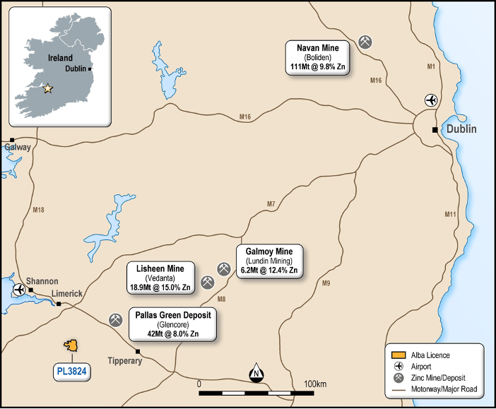 Fig. 1: Location of Alba’s Limerick Base Metals Project (licence area PL 3824) and its proximity to other significant mines in the Irish Zinc Ore Field