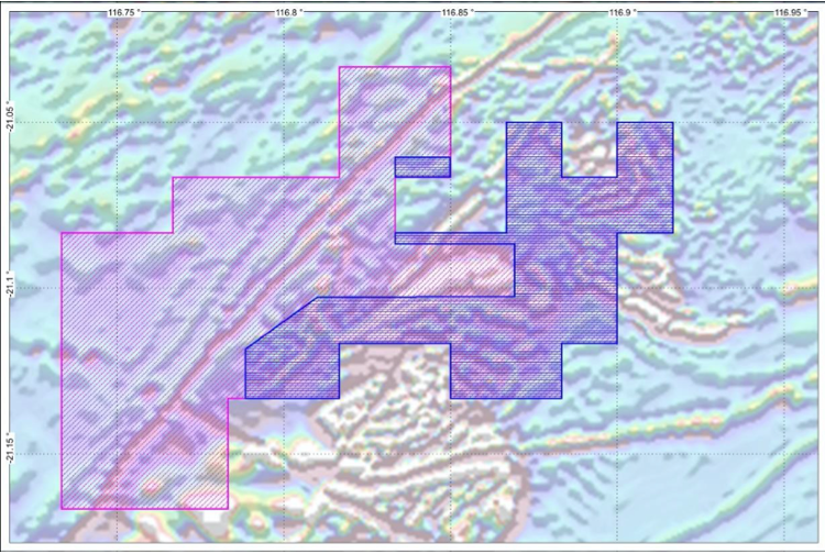 Figure 3: Elizabeth Hill Project Airborne survey area, the magenta polygon is covered by existing multi-client survey and the blue area is the new survey.