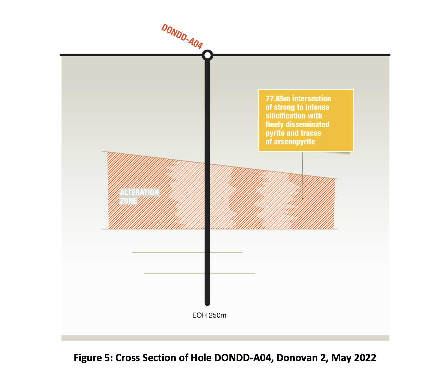 Pictured: Cross Section of Hole DONDD-A04 at Donovan 2 on May 2022, which returned a 78m thick zone of intense alteration and visible sulphides, including pyrite and arsenopyrite.