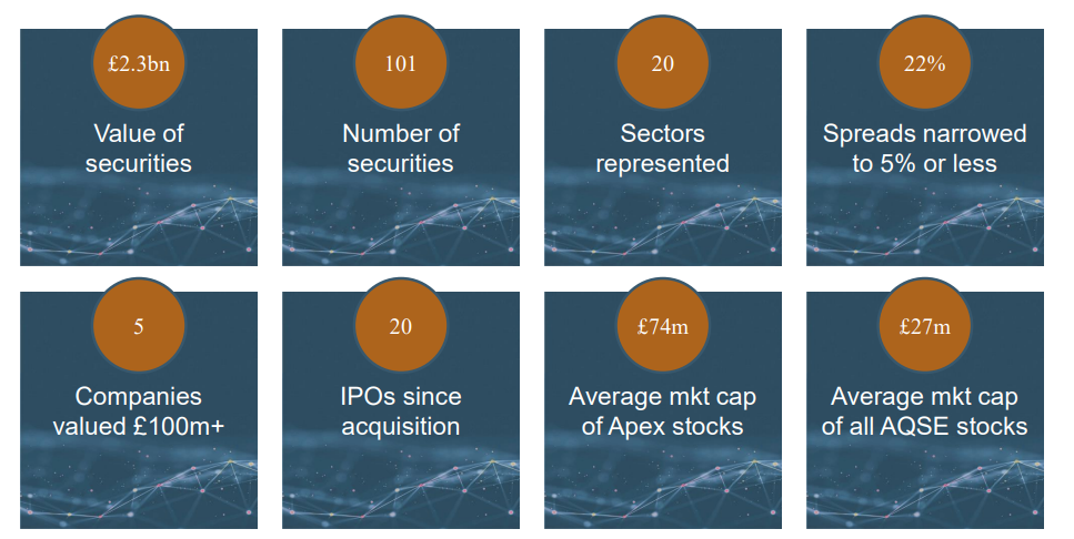Following the completion of the acquisition of AQSE in March 2020, we introduced a number of strategic initiatives which have significantly improved liquidity, spreads and the overall attractiveness of the market. These changes have had a material effect on the number of companies admitted to trading with 14 new admissions during the first half, compared to three in 1H20.
