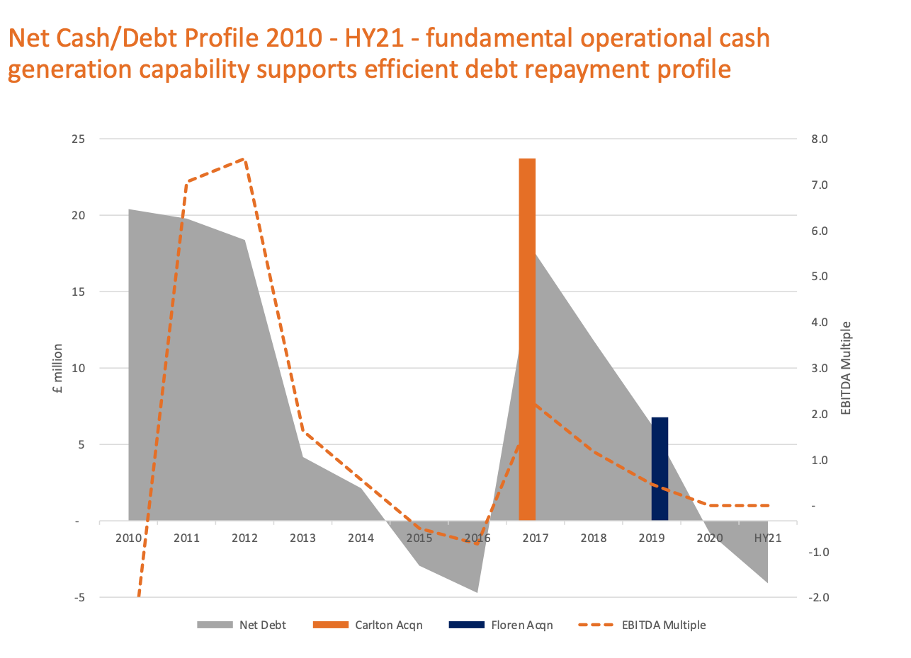 At the half year the Group had net cash of £4.1 million being cash of £14.8 million less bank debt of £10.7 million (30 June 2020: debt of (£6.5 million); 31 December 2020; £0.8 million).