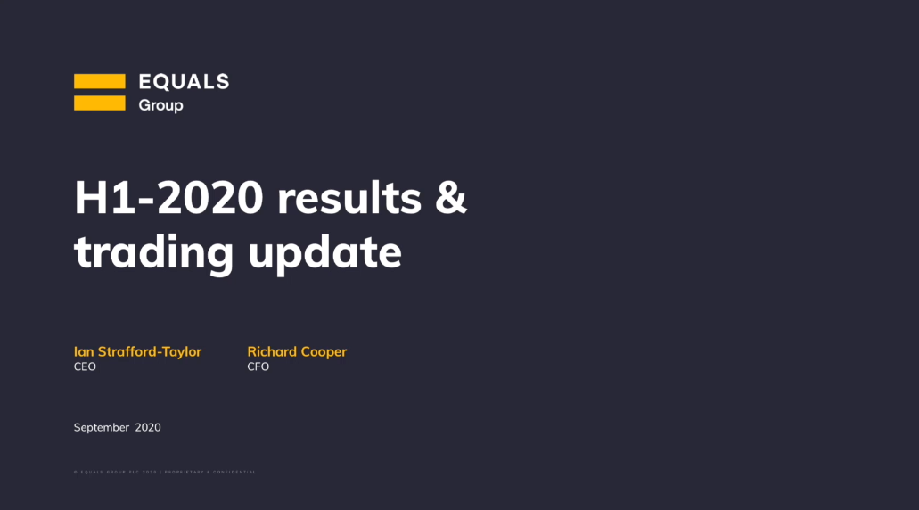 Equals Group  CEO, Ian Stafford-Taylor, and Group Finance Director, Richard Cooper, talk through the groups 1H20 results presentation covering the Company’s resilience through COVID-19, its progress in shifting to B2B revenue streams and its stable cash position.