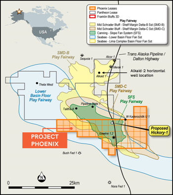 Hickory-1's location was selected adjacent to the Trans Alaskan Oil Pipeline and Dalton Highway, with excellent infrastructure connections. The exploration well will drill to a permitted depth of 12,500 ft, and intersect and test potential oil volumes noted across all mapped play fairways, in particular the SMD, SFS, and BFF reservoirs.