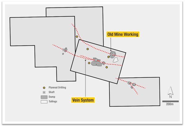 Figure 2: Schematic showing NW trending high-grade silver vein system preliminary drill locations, Los Campos, Zacatecas, Mexico, February 2022