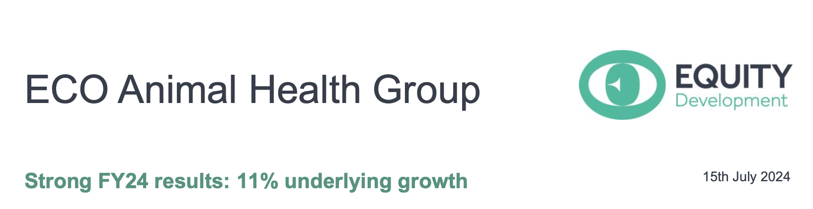 For the year ended 31st March 2024 ECO Animal Health Group reported revenue +5%YoY at £89.4m, which on a currency-adjusted basis was +11%YoY, and (adj.) EBITDA of £8.0m, +11.2%YoY which was ahead of market consensus1 on an improvement in margin from 8.5% to 9.0%. The impact of currency volatility was evident in gross profitability at 42.1% compared to 45.0% a year earlier; H2 recovered to 43.1%. (Adj.) EBIT was 14%YoY lower at £4.6m, a 5.1% margin compared to 6.3% in FY23.