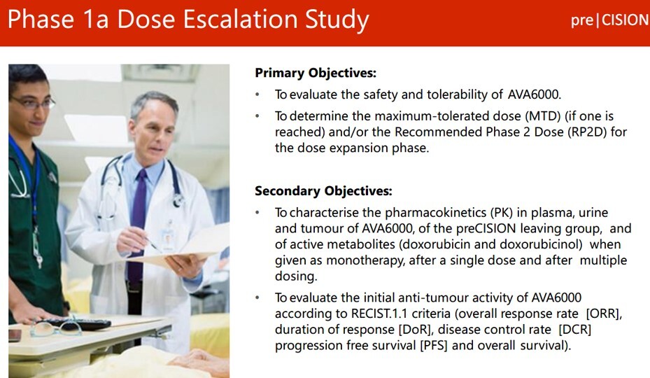 The company announced this morning that its highly promising Phase I trial of AVA6000 Pro-doxorubicin "would advance to the 4th patient cohort using a higher 200mg/m2 dosage. After receiving a positive review of the safety and tolerability data from the 3rd cohort (at 160mg/m2 )."