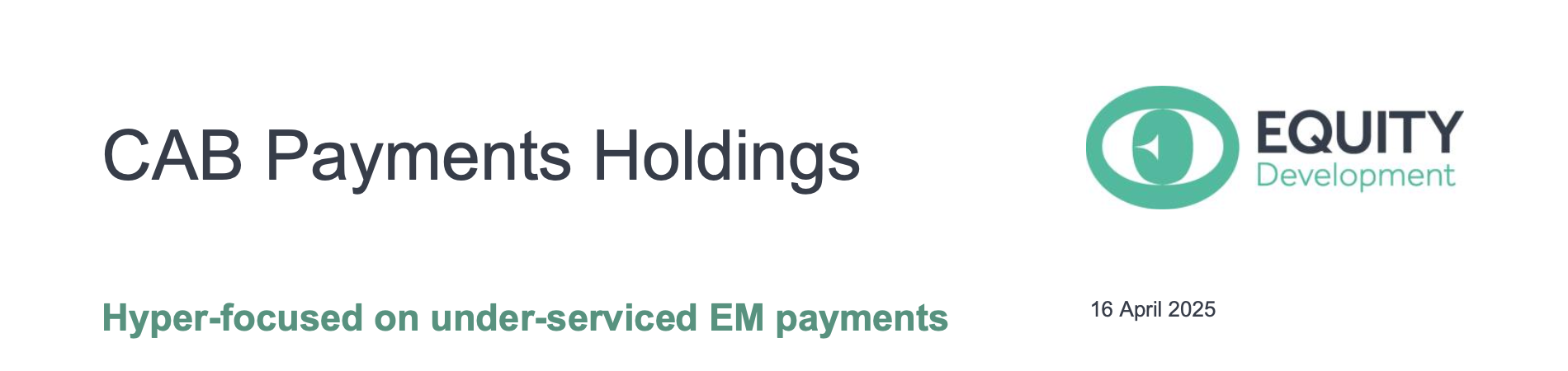 CAB specialises in B2B cross-border FX and payments, facilitating flows (both ways) between developed markets (DMs) and hard-to-reach emerging markets (EMs). Clients are sophisticated institutions such as commercial banks, central banks, payment Fintechs, and international development agencies. Transaction size averages c. US$100k.