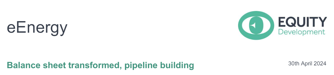eEnergy now has the balance sheet strength to tender for much larger contracts, which we expect to support a significant uplift in revenue and EBITDA from H2’24. The benefits are already being seen with the recent £40m funding facility agreement with NatWest and last week’s (22nd April) major contract with Spire Healthcare. Our Fair Value estimate of 13p per share represents an EV/EBITDA rating of c.8.5x our FY26 forecast. This is in line with the current FY1 EV/EBITDA rating of the peer group. Note that our forecasts do not include the potential benefit of deferred consideration from the EM disposal, which management estimates at between £8m and £10m over the next two years.