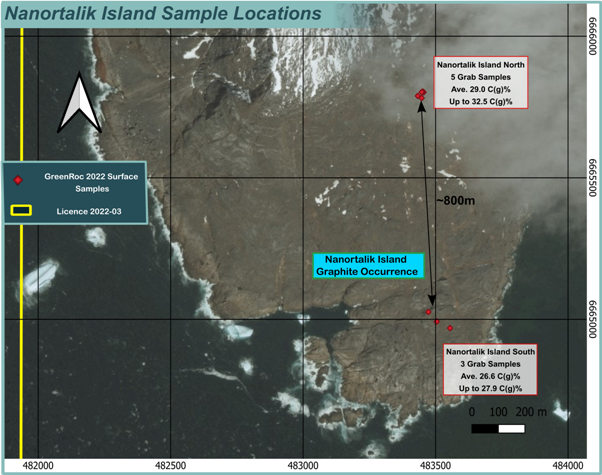 On Nanortalik Island, GreenRoc found graphitic grades of 23.4% C(g) to 32.5% C(g), reported from 8 samples over a strike length of c. 800m (see map below). Graphite bodies remain open along the strike to the north and south, the company reported.