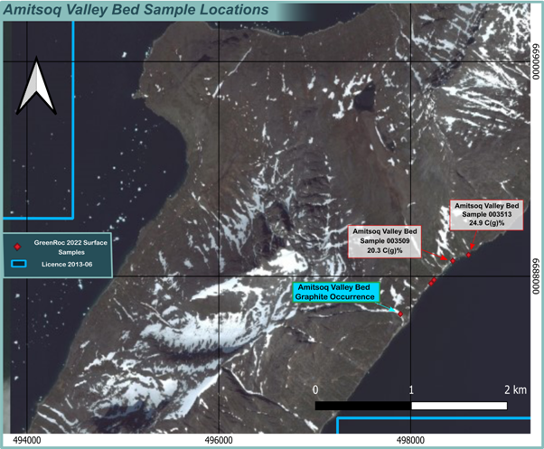 At Amitsoq Valley Bed, GreenRoc identified a new 1km long zone of graphite-bearing rocks with values up to 24.9% C(g) (see map below).