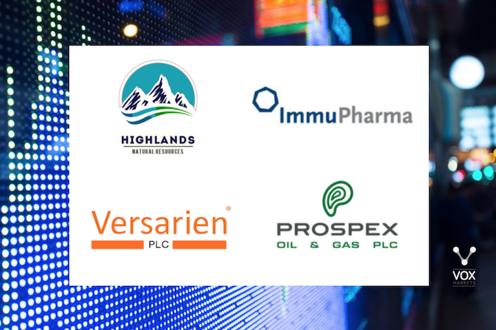 On today's Vox Markets Podcast: Highlands Natural Resources, Immupharma, Versarien and Prospex Oil & Gas