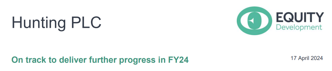 Commentary and financial metrics in Hunting’s AGM/Q1 update confirm that the company has progressed in line with its FY24 targets thus far in year-to-date trading. Q124 EBITDA was well ahead year-on-year. This represents a good step towards the flagged US$125m-135m range for the year, with ongoing momentum in the strongest market segments. Guidance and our own expectations are unchanged, but our fair value adjusts up to 436p per share (from 407p).
