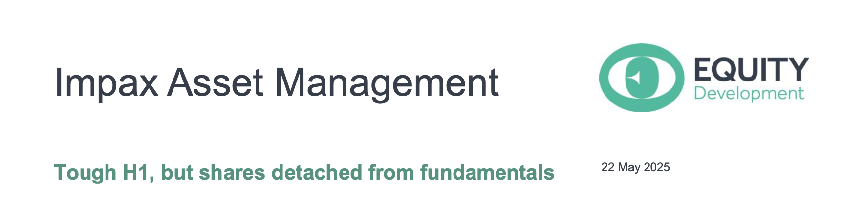 Given previous updates, the challenge of H1 is no surprise. AUM fell 32% to £25.3bn, with half of the fall due to two cancelled (low margin) St James’s Place (SJP) mandates. Revenue fell 11% y-o-y to £76.5m, adjusted operating profit 21% to £20.5m, and investors can expect a fall in full-year dividend (page 12). But Impax is hardly the disaster implied by its share price, which is down 31% over six months and 68% over 12 - a forward PE of just 8.5 for a business with £65m of net cash and no debt. Indeed, a £10m share buyback is announced. Even after the AUM fall, this is a robust business with a huge opportunity, and we see a strong medium-term scope for recovery in fundamentals. We make only small adjustments to our forecasts (page 13) and our DCF valuation remains 400p / share, more than twice the share price.
