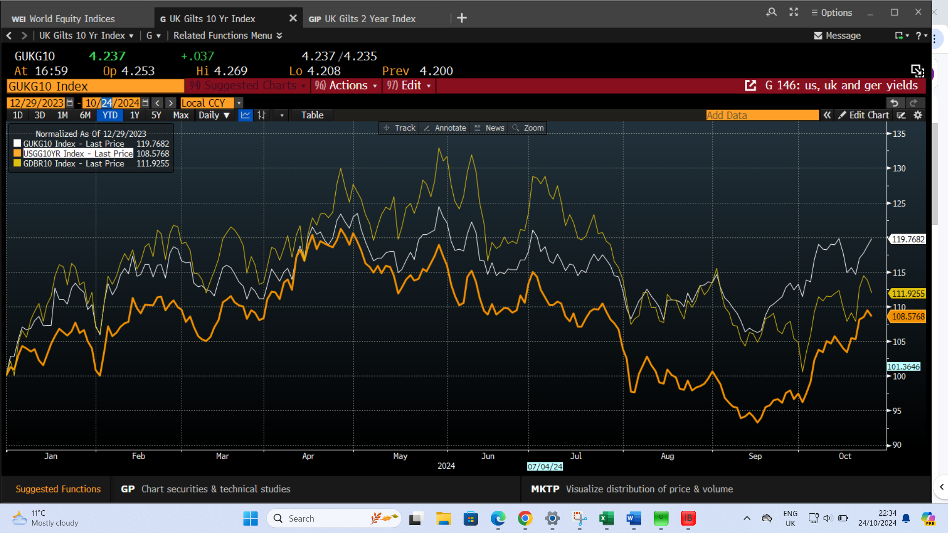 This is hardly a ‘Truss-like’ market reaction, however, it adds to the upward pressure on the 10-year bond yield, which has already risen by more than 50 basis points in the past month. UK yields have also outpaced US and German yields in recent weeks, as you can see in the chart below, which has normalized US, UK and German 10-year bond yields to show how they move together.