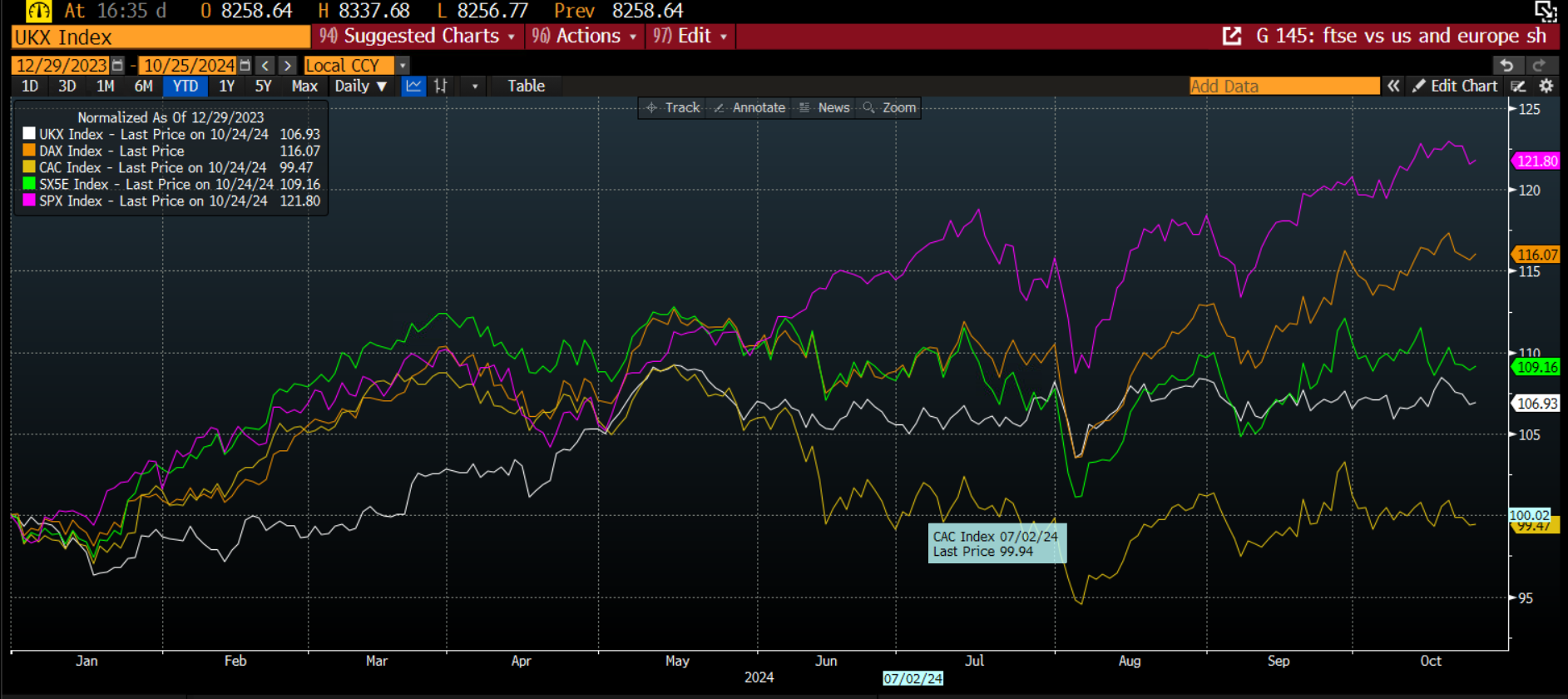 Chart 2: FTSE 100, S&P 500, Eurostoxx 50, Dax and Cac 40. They have been normalized to show how they move together YTD.