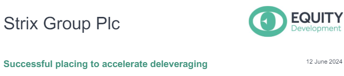 Strix has completed a new equity placing initiated by an investor that will raise approx. £8m of proceeds, with the placing shares expected to be admitted to trading on 14 June. The funds will accelerate the pace at which it achieves self-imposed targets on the level of headroom on its key banking covenant. As such, the refinancing of the Group’s banking facility set for 2025 should now be on more favourable terms. The group can now speed up investment in sustainable growth should suitable opportunities arise, while remaining cognisant of the balance sheet.