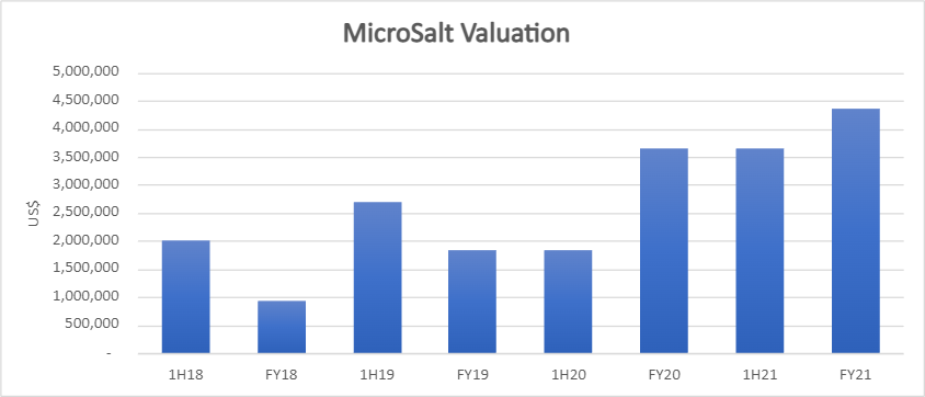 The valuation for MicroSalt has been on the rise since FY18 with a most recent recorded book value of US$4.3m in the November 2021 accounts: