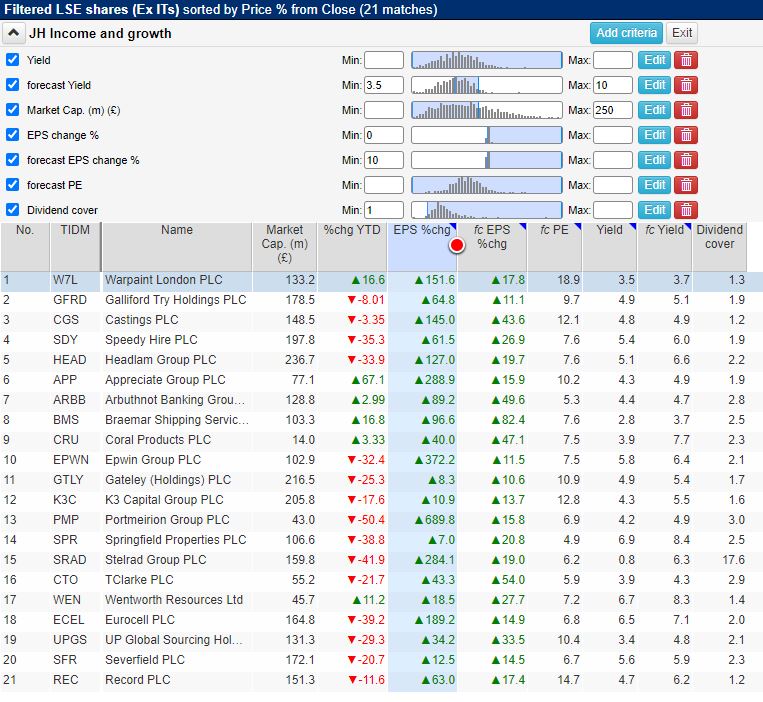 These are companies that are growing earnings but which also pay a dividend. The criteria the companies had to fulfil to fit this screener were: Market Capitalisation below £250m, minimum earning per share forecast growth of 10%, minimum forecast dividend yield of 3.5% and dividend cover of 1.
